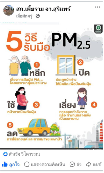 พ.ต.ท.สถาพร สงวนสุข สวญ.สภ.เพี้ยราม มอบหมายให้ เจ้าหน้าที่ตำรวจจิตอาสา ประชาสัมพันธ์ หยุดเผาตอซังข้าวลดฝุ่น PM 2.5 ทางเฟสบุ๊ค สภ.เพี้ยราม