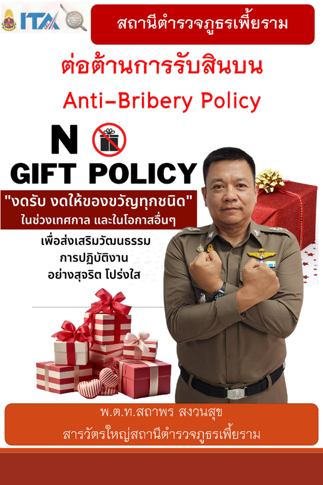 เมื่อวันที่ ๒๓ มกราคม ๒๕๖๗ เวลา ๑๔.๐๐ น. ณ สภ.เพี้ยราม ได้ดำเนินการประชุมการขับเคลื่อนการประเมินคุณธรรมและความโปร่งใส ในการดำเนินงานของหน่วยงานภาครัฐ (Integrity & Transparency Assessment: ITA) ของสถานีตำรวจภูธรเพี้ยราม ประจำปีงบประมาณ พ.ศ.๒๕๖๗ ครั้งที่ ๒/๒๕๖๗ โดยมี พ.ต.ท.สถาพร สงวนสุข สารวัตรใหญ่สถานีตำรวจภูธรเพี้ยราม จัดกิจกรรมมอบนโยบายต่อต้านการรับสินบน (Anti Bribery Policy) และการไม่รับของขวัญของกำนัลหรือประโยชน์อื่นใด (No Git Policy) จากการปฏิบัติหน้าที่ และให้ปฏิบัติหน้าที่ตามหลักคุณธรรมและความโปร่งใส ยึดถือระเบียบ และกฎหมายบนพื้นฐานของจิตบริการ (ServiceMind) เพื่อประโยชน์สูงสุดของประชาชนเป็นสำคัญ รวมทั้งประกาศนโยบายต่อต้านการรับสินบน(Anti-Bribery Policy) และการไม่รับของขวัญของกำนัลหรือประโยชน์อื่นใด (No Gift Policy) จากการปฏิบัติหน้าที่ ประจำปีงบประมาณ พ.ศ.๒๕๖๗ ของสถานีตำรวจภูธรเพี้ยราม