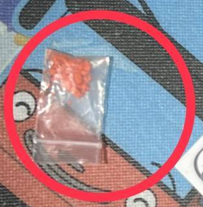 ของกลาง (ลำดับที่ 3) ยาบ้าลักษณะเม็ด กลม แบน ด้านหนึ่งผิวเรียบ ด้านหนึ่งมีรูป WY เม็ดสีแดง จำนวน 1 ถุง ซิปล็อค แบ่งเป็น 2 เม็ดที่แตก และยาบ้าที่แตกเป็นเสี่ยงๆ ชั่งน้ำหนักได้ 0.6 กรัม